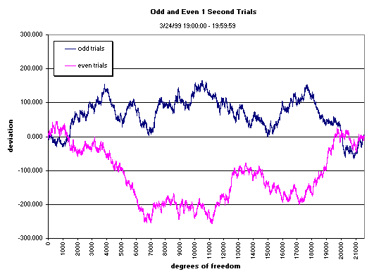 A very good check on the reliability of an analysis can be generated by arbitrarily splitting the data into two halves, and processing them independently. If the impression of an effect in the data is in fact based on chance fluctuations, it is not likely to show in both halves. On the other hand, if there is a source driving the effect, it should manifest in both subsets independently. The following figure shows the results of a split half analysis on the Yugoslavia Bombing data using this algorithm: split the 1 second trials into odd and even buckets (1st second, 12 egg trial values into table A, 2nd second, 12 egg trial values into table B etc...) We notice that the two data series mirror each other in their major features and the final chi-square value for BOTH series is 21599.0 at 21,600 df.