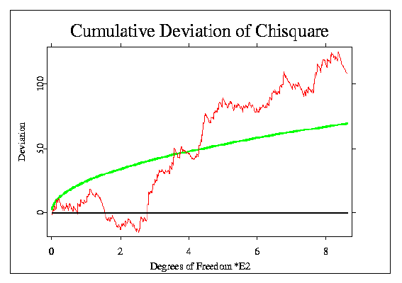 | NEW YEAR TRANSITION One of the most obvious events for which some predictions might be made is the relatively world-wide celebration of the New Year transition. The primary prediction is for an accumulation of deviations across all timezones, but first we may want to look at the context. A global perspective of the GCP network activity may be gained from a look at the cumulative deviation of Z² (Chisquare) for the last day of 1998 (UTC), where we see apparently random fluctuation with a slight negative trend (see graph below), ![]() and the first day of 1999 (UTC), which shows a highly significant composite deviation (Chisquare is 971.4 on 863 df, p = 0.0058) (see graph below).